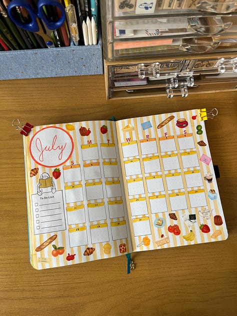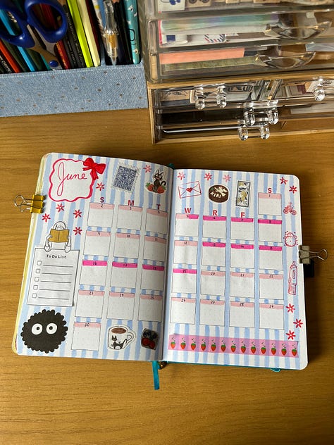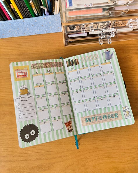 A motif I first tried out in June (in the Kiki-inspired iteration), I became obsessed with using a stripey background for my calendars. I made them with the brush tip of a Tombow Dual Brush pen, and then added stickers on top. I canât choose a favorite stripe, here are all three flavors:
