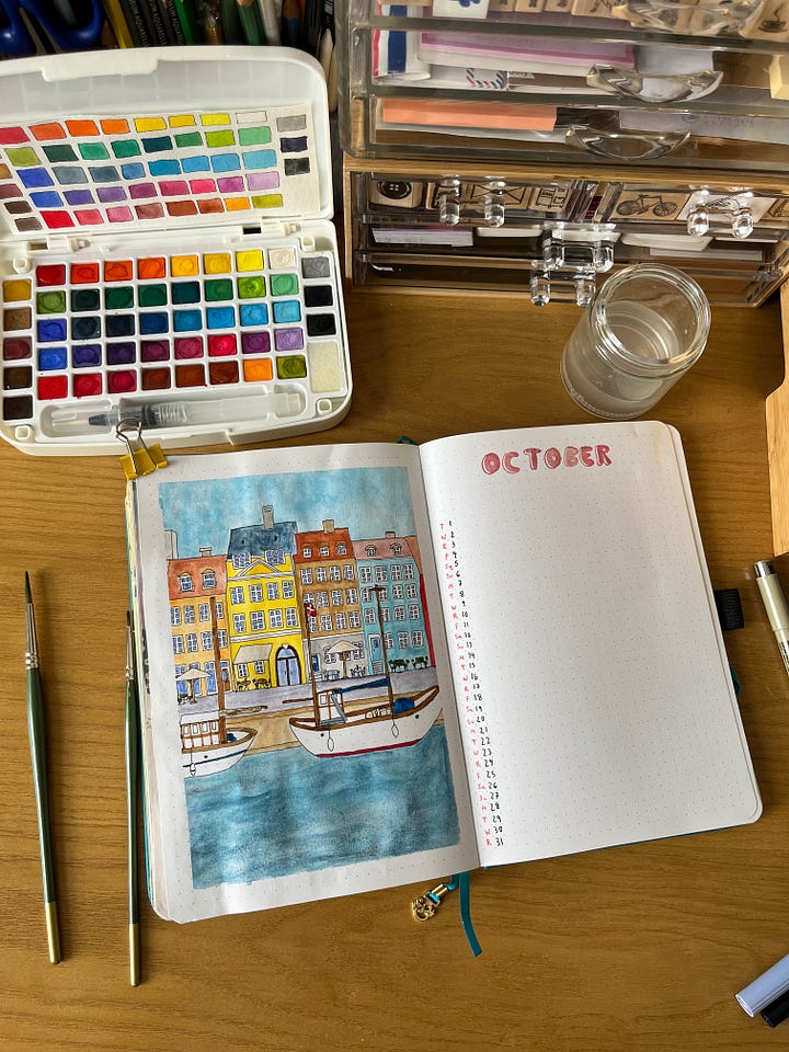 My Bullet Journal themes are often informed by the seasons and my travels, and this fall I went to Copenhagen for the first time! I painted the famous Nyhavn harbor for my big October drawing, and later in the month, I saw it in real life (on a cloudy day, of course). A little side by side of the photo I took + my drawing can be seen above. + Painting process video here!