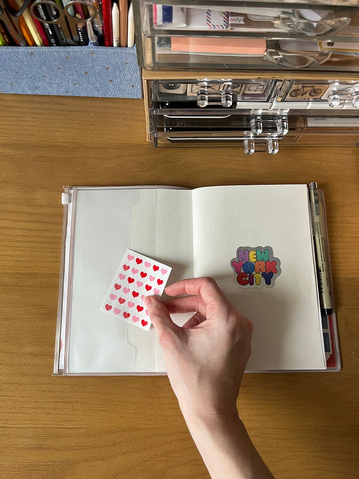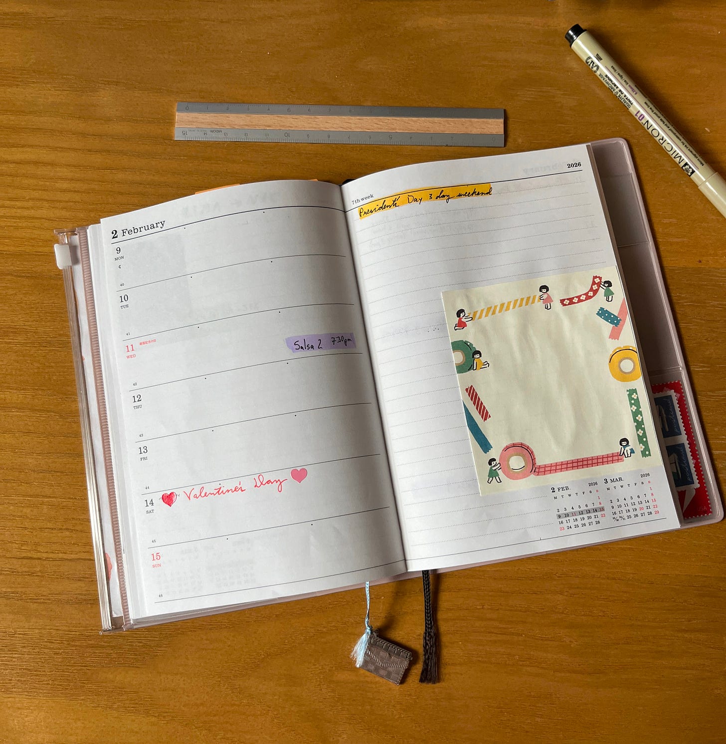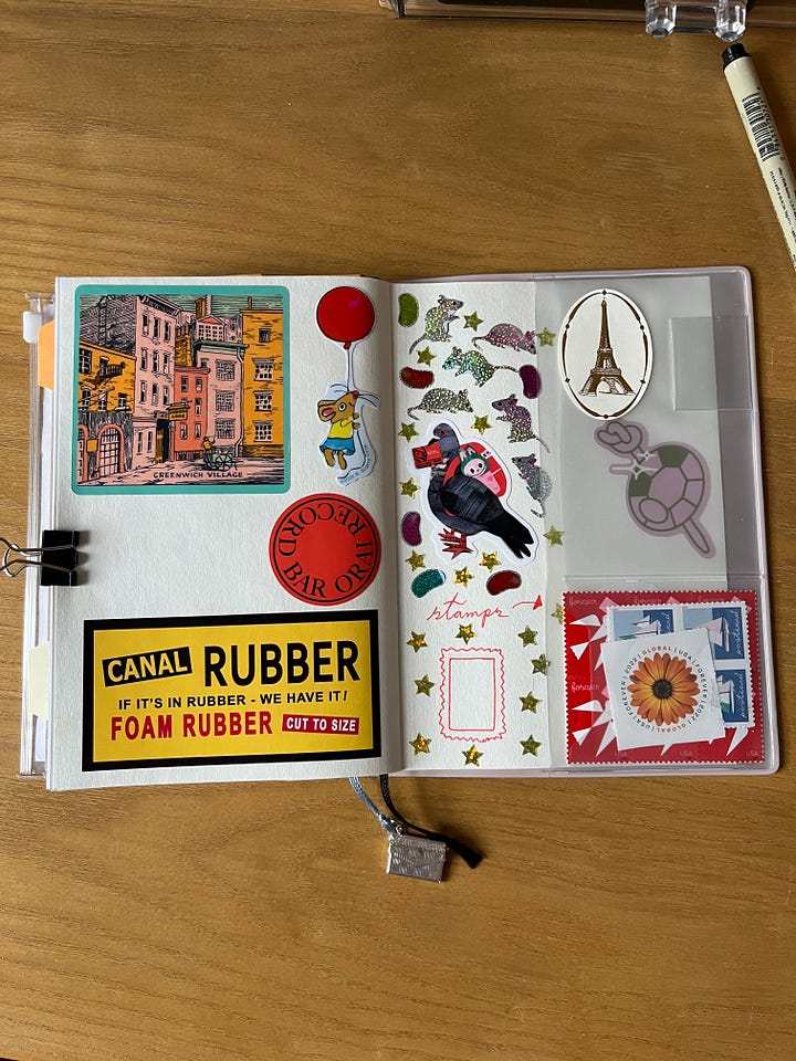 As usual, I’ve decorated the inside front and back cover pages with stickers. There are pockets of varying sizes, and I love that they are transparent, because I often forget I’ve placed anything on the inside covers at all in my other notebooks. I am especially excited to always have postage stamps at my disposal in my new planner, so I can send postcards from anywhere4!