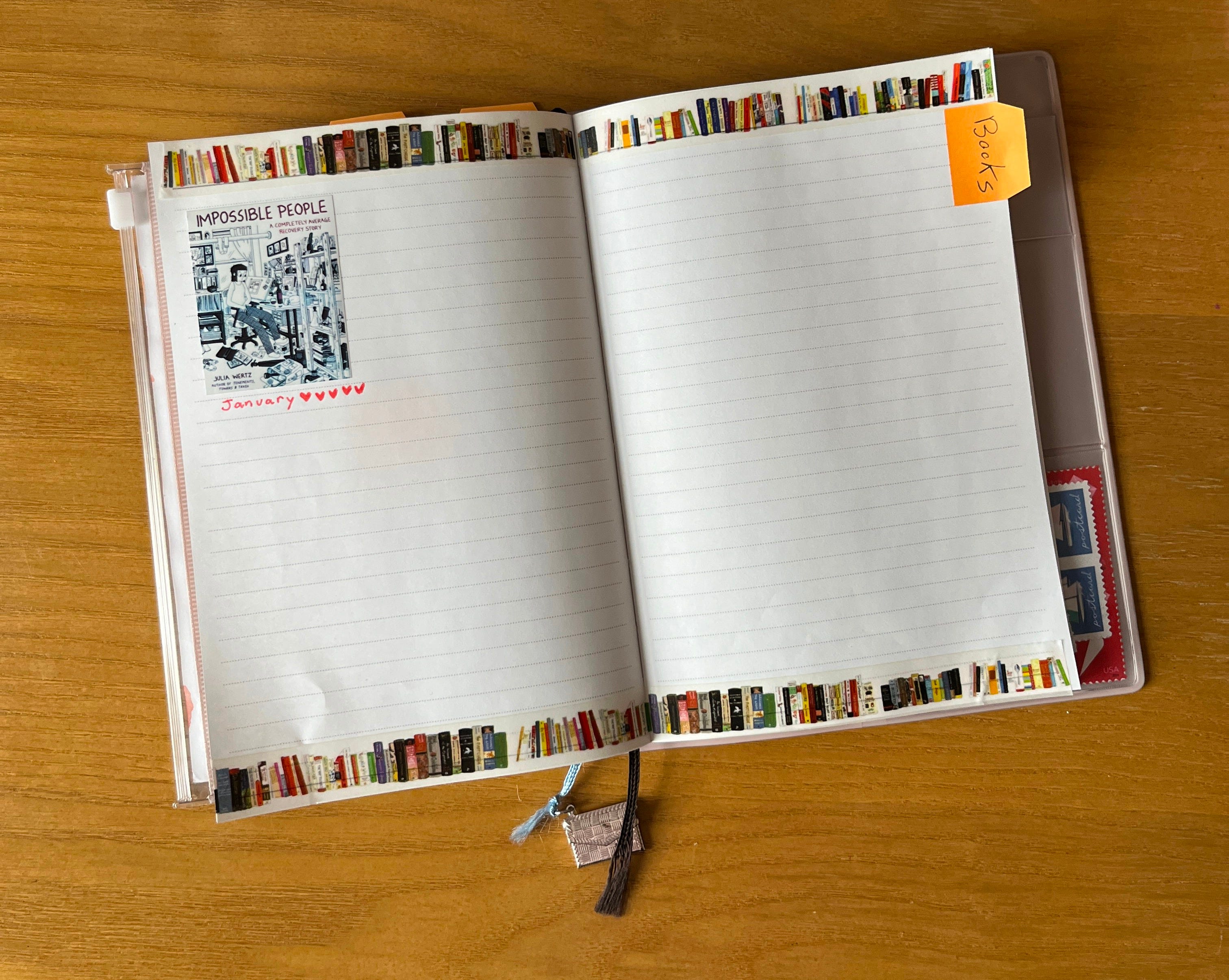 Inspired by fellow journaler (Hobonichi) and mutual, MostlyMady, I dusted off my pocket-printer and started a book tracker, focused on featuring the covers of books. I’m mostly winging it, and was excited to mark down my first read of the year, Impossible People, a graphic novel by Julia Wertz3.
