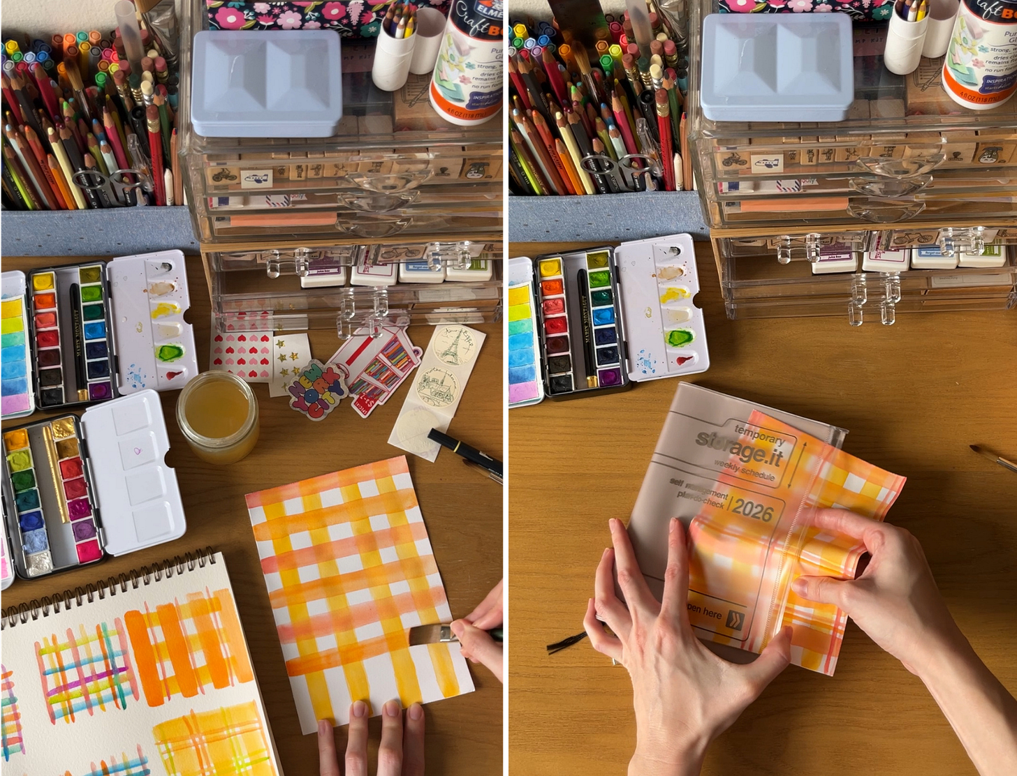 I found this planner to be so unique due to its somewhat utilitarian-in-design, resealable, transparent cover. As soon as I got home, I got to work creating a custom cover by painting a piece of paper to place inside the plastic sleeve.