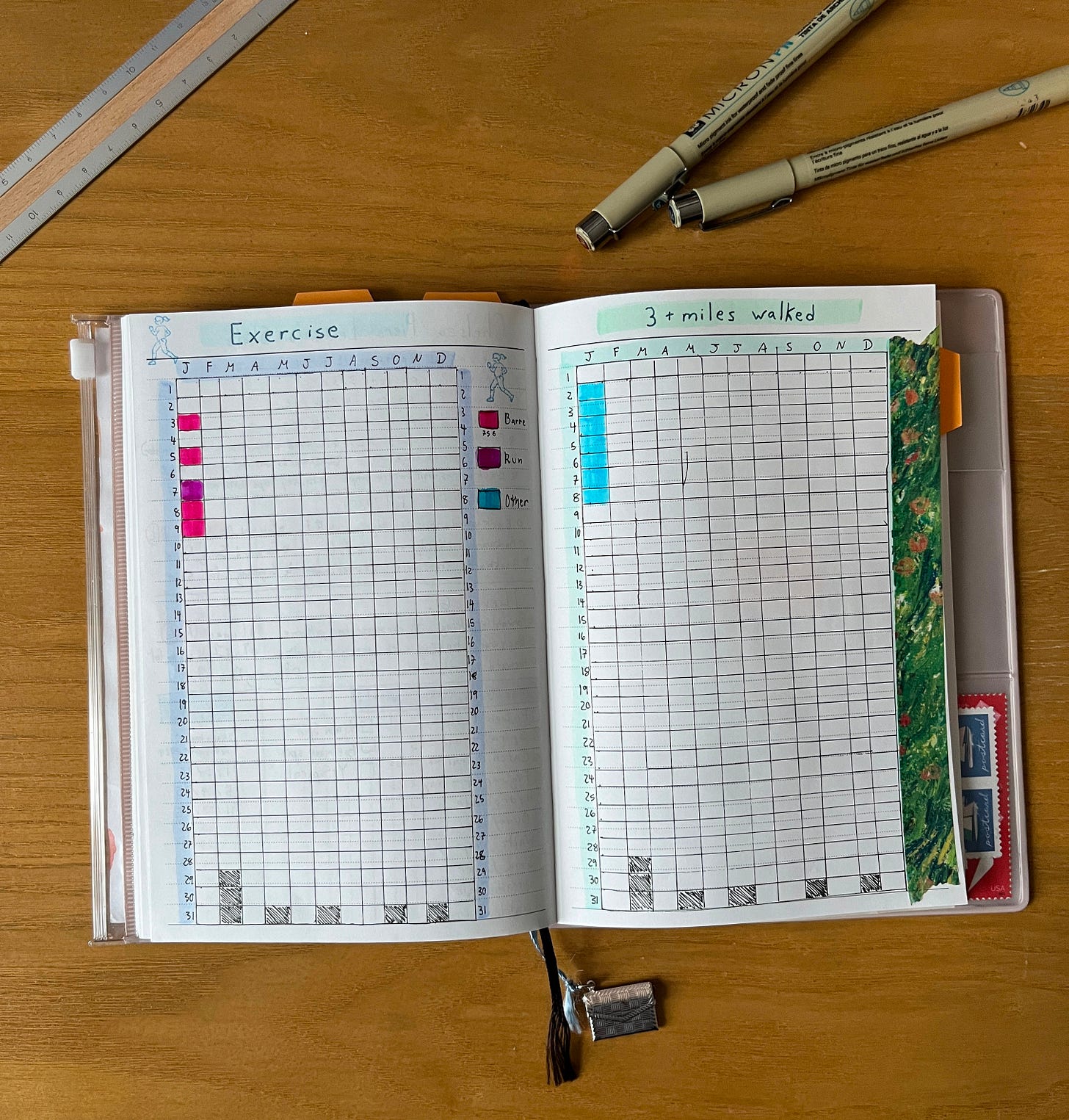 This planner has a continuous weekly format, with no pages to break out the months. Instead of monthly trackers, I’ve consolidated my tracking to yearly layouts in the allotted blank pages at the back of the notebook, a far more efficient system than before, and one that I’m excited about!
